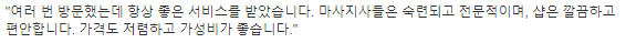 | 장점 | 깨끗하고 편안한 분위기 친절하고 숙련된 저렴하고 합리적인 가격 |