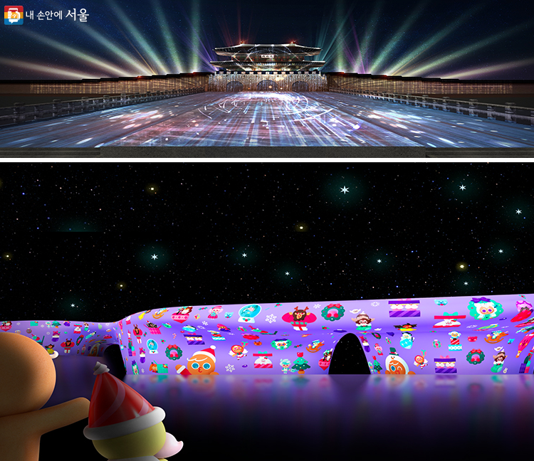 첫 번째로 소개할 곳은 광화문광장입니다. 서울의 역사와 문화의 중심지로, 100년 만에 복원된 광화문 월대부터 광화문광장까지 800m 길이의 초대형 미디어파사드가 구현됩니다. 미디어파사드란 프로젝터를 활용해 건물이나 벽면에 빛으로 이뤄진 영상을 투사하는 기술입니다. 이 미디어파사드는 시각적으로 뿐만 아니라 역사적으로도 신선하고 감동적인 경험을 선사합니다. 또한 광화문광장에서는 크리스마스 마켓도 열리는데, 이곳에서는 다양한 음식과 상품, 체험과 공연을 즐길 수 있습니다. 광화문광장에서는 서울빛초롱축제도 함께 진행되는데, 이 축제는 '화이트 나이트 인 서울’을 테마로 한 대형 조형물을 중심으로 화려한 빛의 향연을 펼칩니다. 특히 360도 입체 구 형태로 프로젝션 맵핑이 가능한 '시공의 달’과 2024년 '용의 해’를 맞아 신비로운 구름 사이에서 깨어나는 용을 형상화한 조형물 등이 눈길을 끕니다.