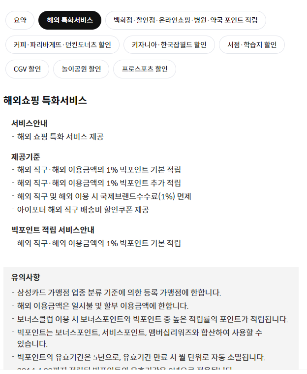 해외 쇼핑 포인트 적립: 해외 가맹점에서 기본 1%의 포인트리를 적립, 전월 국내 사용 실적에 따라 추가 1~2%의 포인트리를 더 적립해줍니다. 적립한도는 무제한